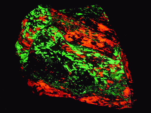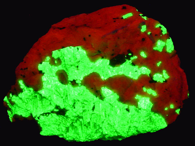 Name & Location: Calcite, Willemite, Sterling Hill Mine, Ogdensburg, New Jersey.
