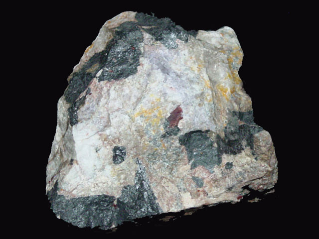 Name & Location: Willemite, Calcite, Sphalerite, Zincite, Sterling Hill Mine, Ogdensburg, New Jersey.