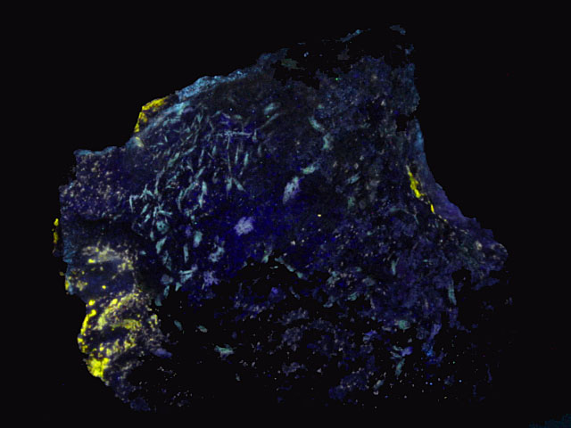 Notes: Bityite is a rare member of the mica group. Specimen is very rich with medium bright fluorescing bityite and bright yellow fluorescing fluorapatite.
