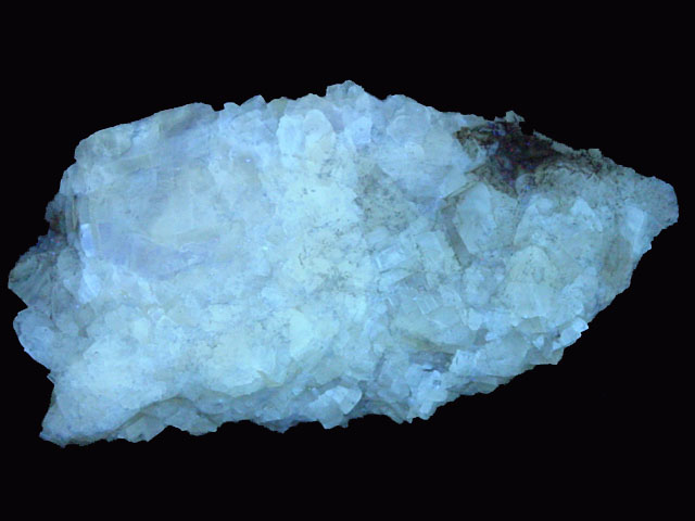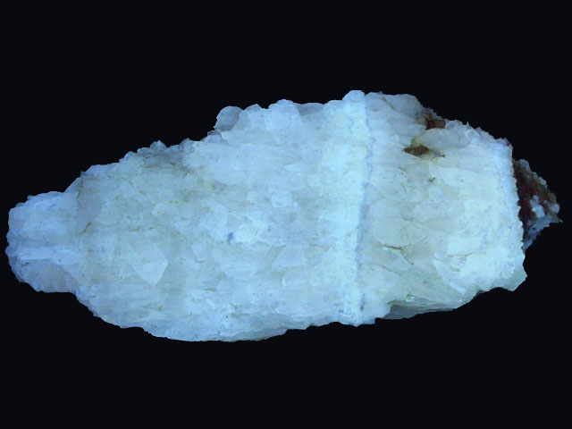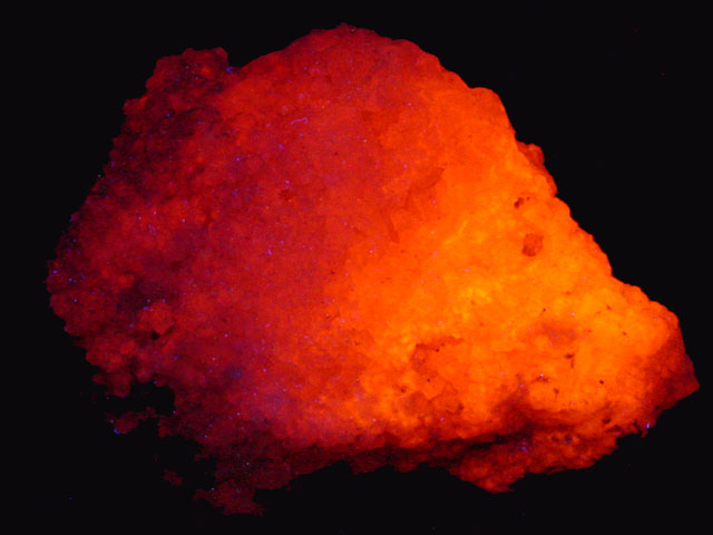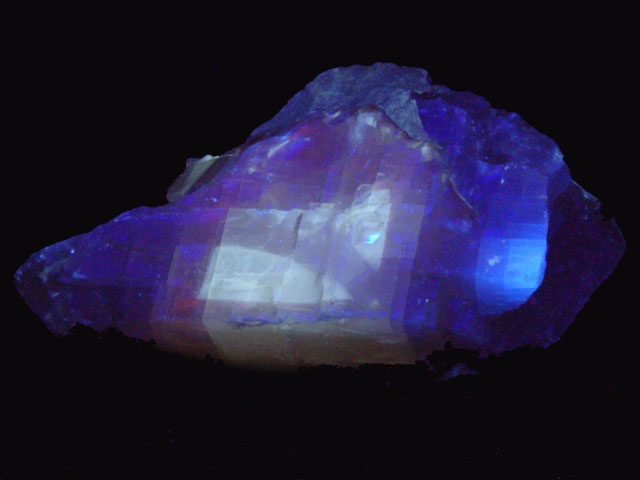 Notes: Interesting fluorescent calcite, photographed with a powerful Convoy C8+ Longwave LED flashlight.