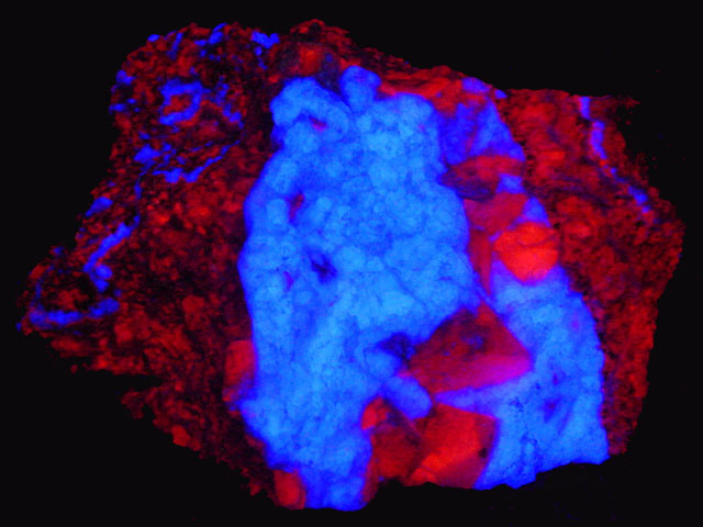 Notes: Bright red feldspar with chlorophane. Teal colored sustained luminescence and thermoluminescent.